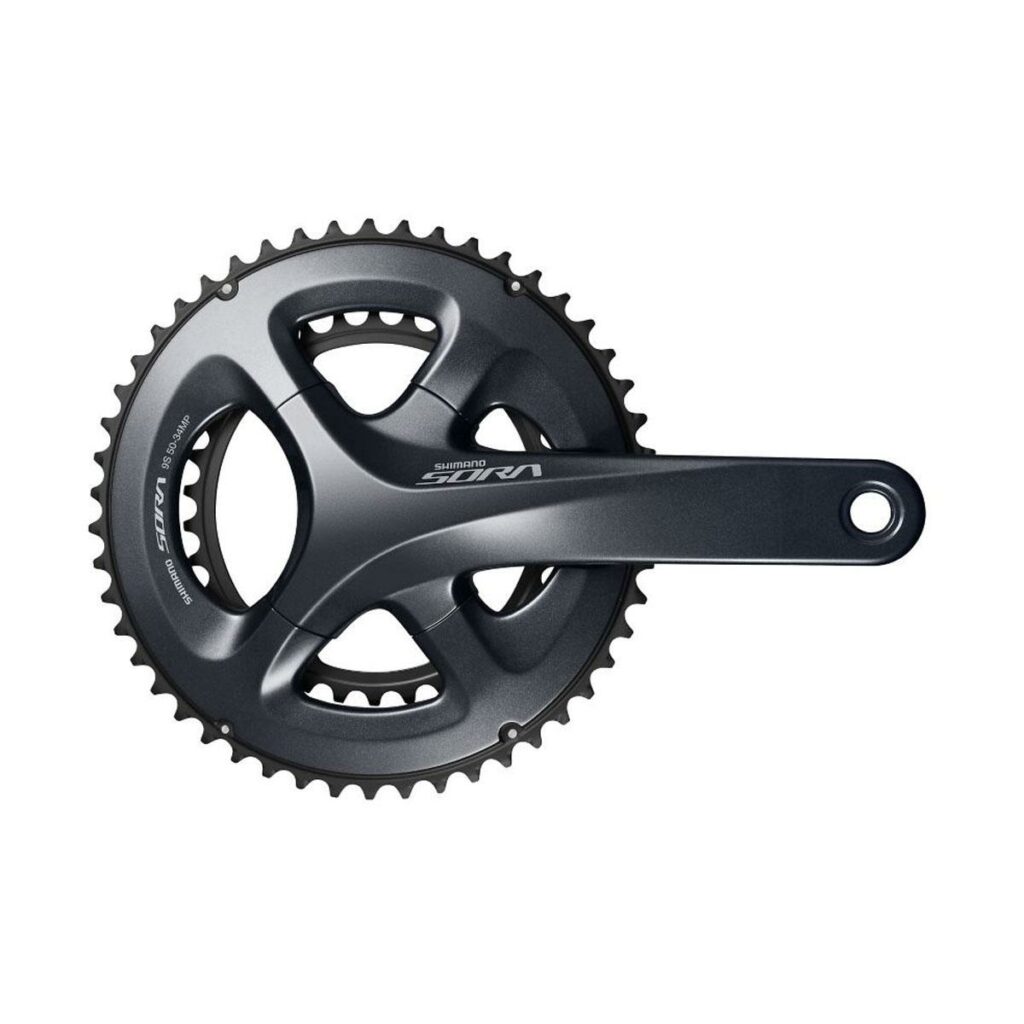 Stred SORA R3000 s integrovanou oskou ( 2-piece ), pre 9 rýchlostné prevody, kľuky z hliníkovej zliatiny s prevodníkmi z hliníka. Integrovaná osa zaručuje maximálny prenos výkonu z jazdca na bicykel.