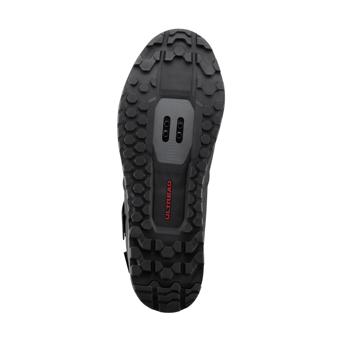Gumená zmes SHIMANO ULTREAD GE optimalizovaná pre enduro a vzor dezénu podrážky zaisťujú spoľahlivé šliapanie a priľnavosť na bicykli aj mimo neho.
