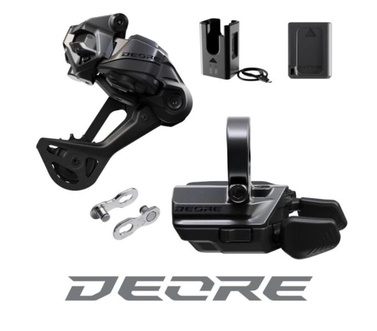 Balenie obsahuje: Prehadzovačku, radenie (ovládač), nabíjačku, batériu, rýchlospojku reťaze (QuickLink). Montáž radenia: na objímku.